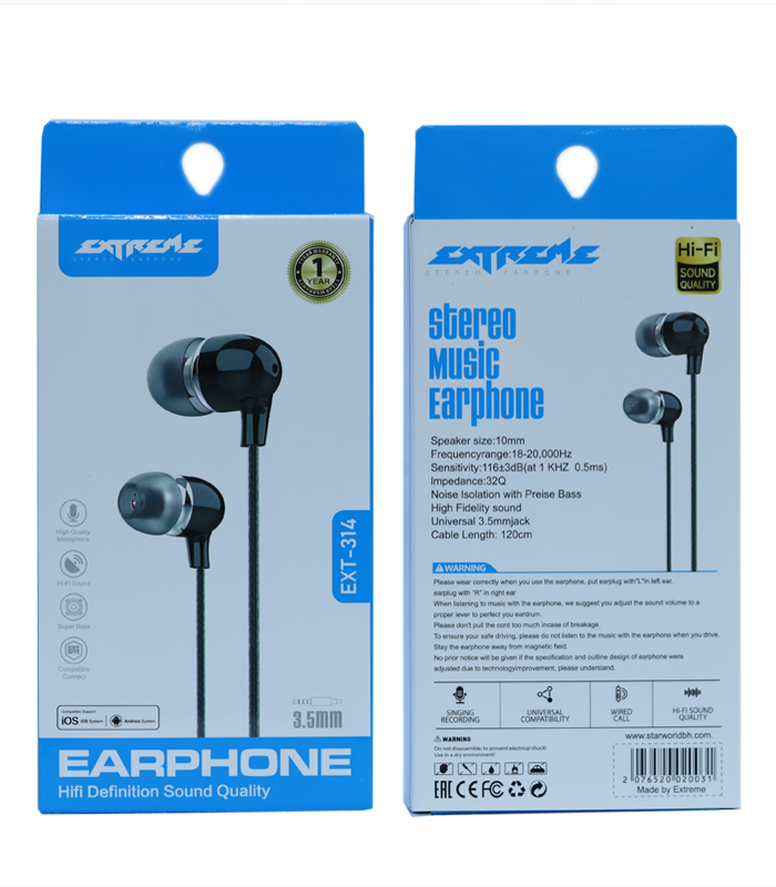 EXTREME Stereo Music Earphone EXT-314 – Hi-Fi Sound, Deep Bass, 3.5mm Wired Earphones