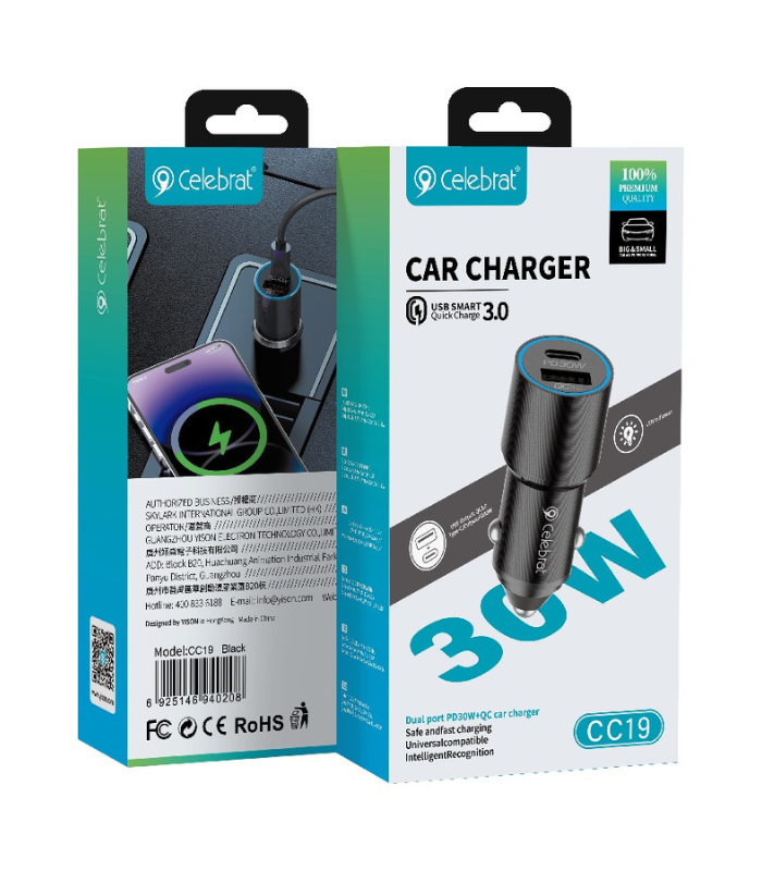 The Celebrat CC19 YT12 30W Car Charger is designed to deliver fast and safe charging for your devices on the go. With high-speed charging output, it ensures your smartphone, tablet, and other USB-powered devices charge quickly during travel.