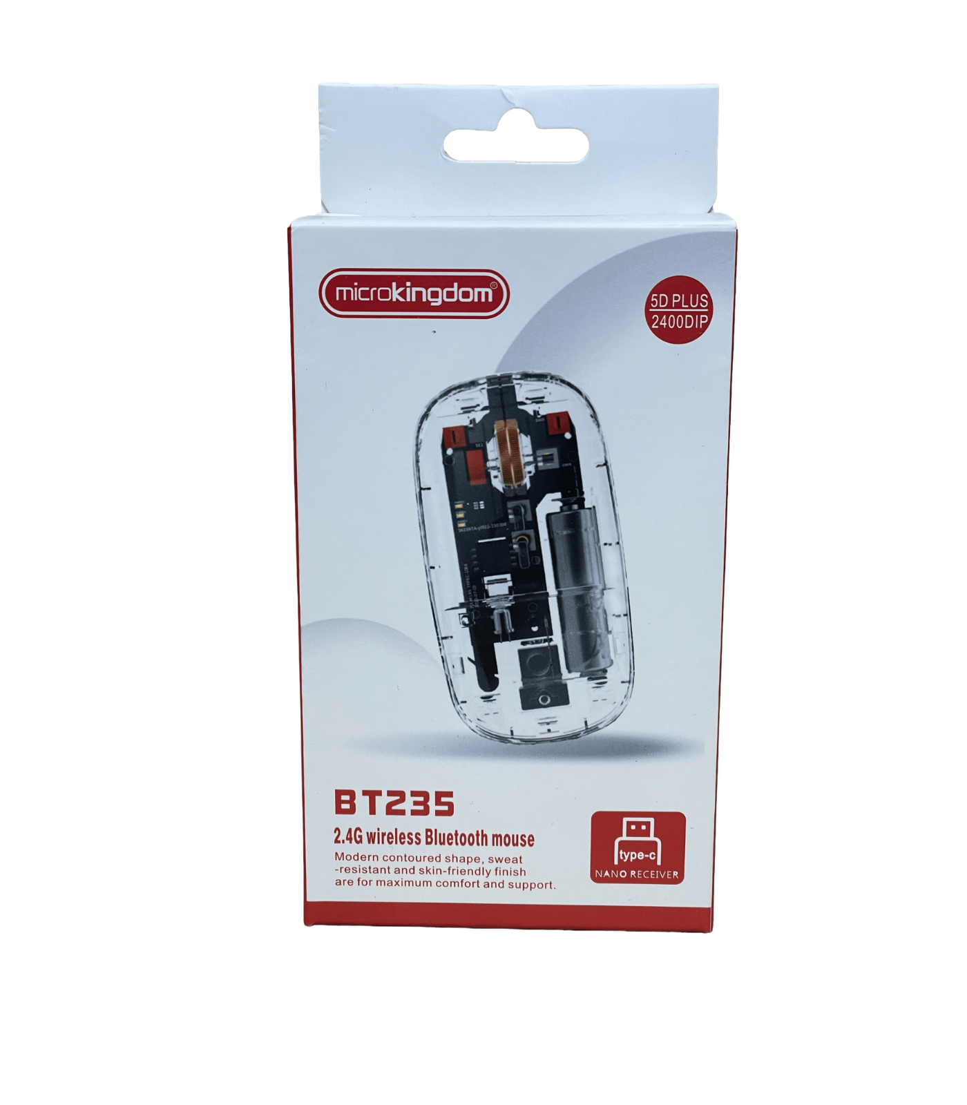 The Microkingdom BT235 Wireless + Bluetooth Transparent Mouse – JRM501 combines modern aesthetics with advanced functionality. Designed with a sleek transparent body, this mouse adds a premium and stylish touch to your workspace while delivering smooth and reliable performance.