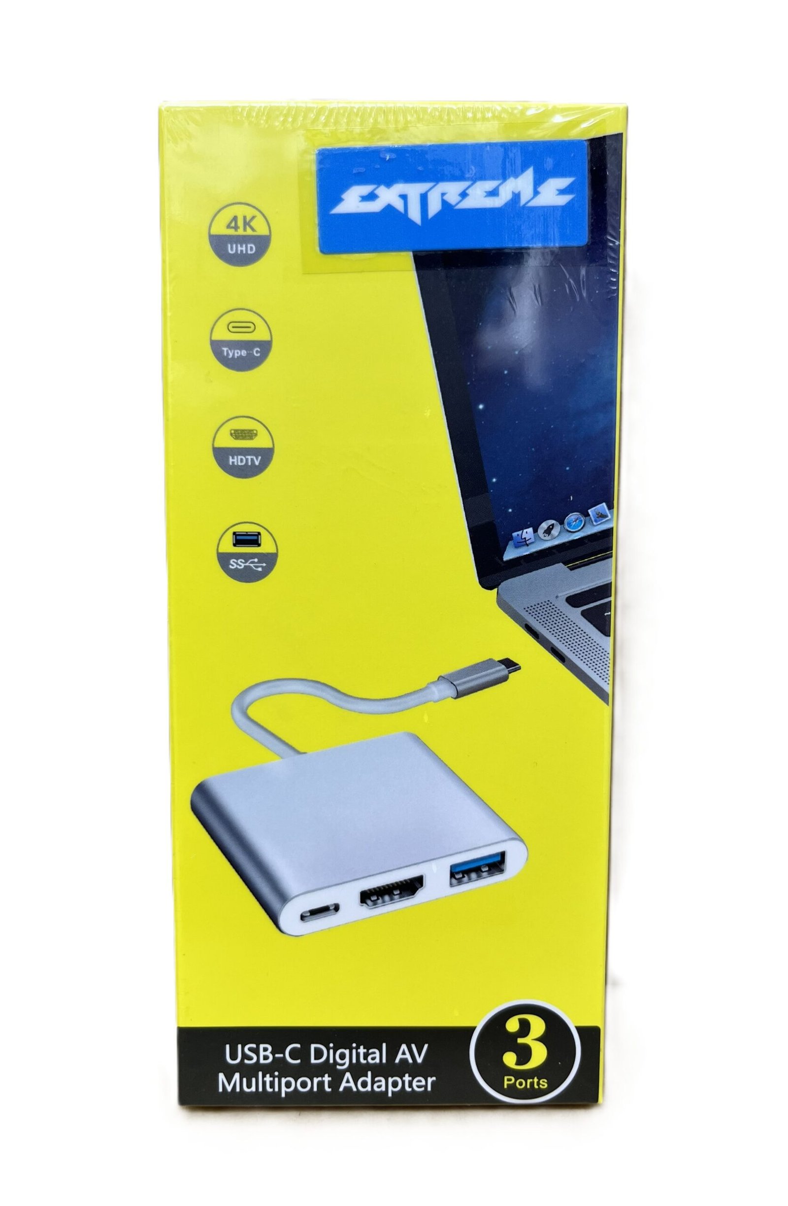 The Type-C to 3-in-1 Adapter Yellow Extreme is a compact and stylish multiport adapter designed to expand your USB Type-C device into multiple essential connections. It is perfect for users who need convenient access to display, data transfer, and charging from a single port.